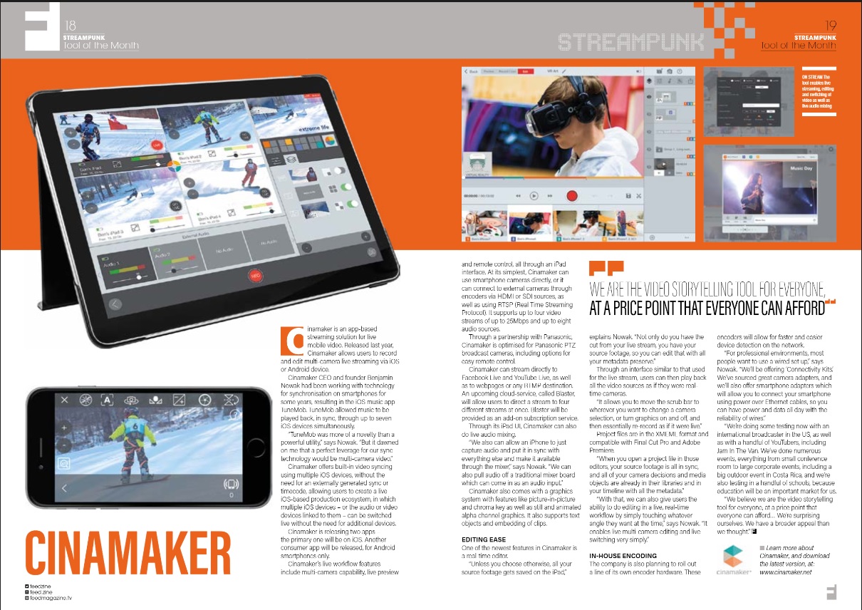 Enabled by patented PerfectSync technology, Cinamaker allows creators to capture, record, and switch between multiple cameras of all kinds. They can also record and mix up to eight audio channels and embed media assets. Then, with a tap of the screen, users can live stream to Facebook, YouTube, Twitch, or other platforms and sites for instant distribution. Finally, creators can revisit footage via a live editing workflow, letting them re-edit their recording with the in-app editor--in real time. “We built Cinamaker to save creators and videographers countless hours in post production,” explains Baker. “They can also seamlessly transfer their synchronized media and metadata into the timeline of their preferred video editor for post-production refinement.”
